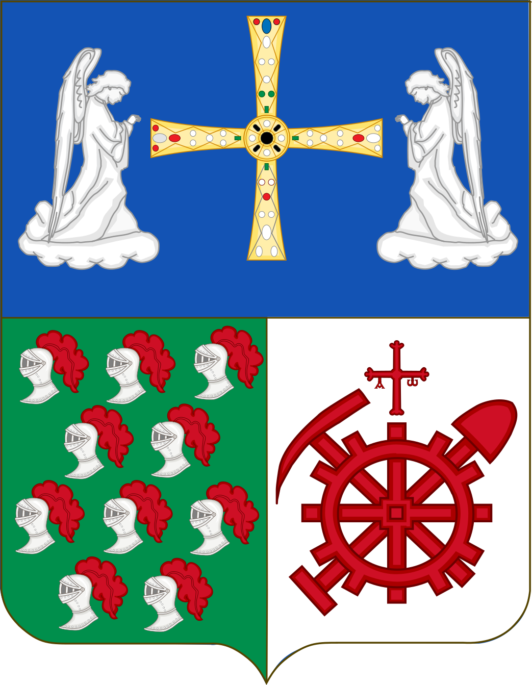Escudo cortado y medio partido. Primer cuartel: de azur con la Cruz de los Ángeles en oro y piedras preciosas, acompañado de dos ángeles arrodillados. Segundo cuartel partido: de sinople, diez yelmos de plata con airón de gules, puestos 3,2,3,2. Tercer cuartel, de plata, pico y pala puesto en aspa cargado de una rueda dentada, el todo surmontado de la Cruz de la Victoria, y todos ellos de gules.